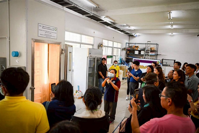 ในช่วงบ่าย ผศ.ดร.กาญจนา นาคประสม คณบดีคณะวิศวกรรมและอุตสาหกรรมเกษตร พร้อมด้วยคุณสุมิตร เชื่อมชัยตระกูล หัวหน้าศูนย์บริการวิชาการ ให้การต้อนรับ รองเลขาธิการ มกอช. เจ้าหน้าที่จาก มกอช. กรมวิชาการเกษตร และผู้ประกอบการลำไยสดจากจังหวัดเชียงใหม่ ลำพูน และจันทบุรี เข้าศึกษาดูงาน ต้นแบบห้องรมก๊าซซัลเฟอร์ไดออกไซด์กับผลลำไยสดด้วยระบบบังคับอากาศแนวตั้ง และการรมก๊าซซัลเฟอร์ไดออกไซด์ในลำไยสดร่วมกับก๊าซโอโซน ซึ่งเป็นเทคโนโลยีที่ช่วยควบคุมปริมาณก๊าซและกระจายตัวได้ทั่วถึง ทำให้ปริมาณสารตกค้างอยู่ในระดับที่ปลอดภัยตามมาตรฐาน และลดผลกระทบต่อสิ่งแวดล้อม
